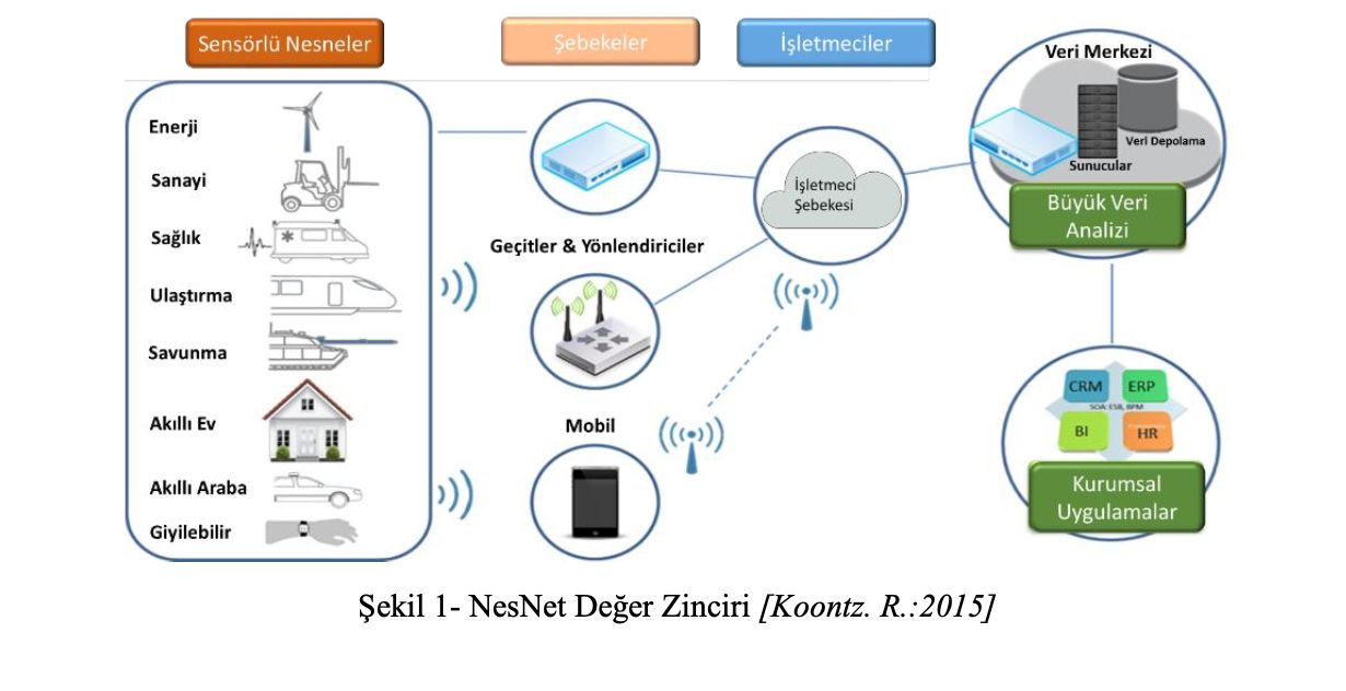 NesNet, her nesnenin, her zaman ve her yerden ağa bağlı olması fikri üzerine kurgulanmıştır. NesNet, değer zinciri Şekil-1’de gösterildiği gibi sensörlerden, şebekelerden, işletmeci ağları ve kurumsal uygulamalardan oluşmaktadır [Koontz. R.:2015].